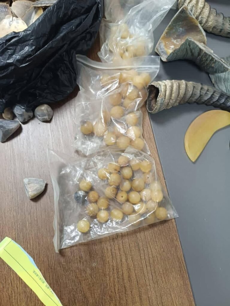 Produtos de origem animal, presumivelmente provenientes de caça furtiva, como escamas de pangolim e chifres de antílopes